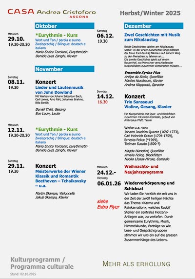 Rund um das Jahr dürfen sich Gäste sowie interessierte Menschen aus der Region auf künstlerische Veranstaltungen oder Vorträge in der Casa Andrea Cristoforo freuen. Das reichhaltige Kulturangebot umfasst Konzerte, Rezitationen, Eurythmie, Märchen-Erzählungen, Betrachtungen zur Sozialen Hygiene, medizinischen Themen, Ernährungslehre, Mal- und Gesangsseminare, Gestaltung der Jahresfeste – Kunst, verstanden als Wegbereiterin und Begleiterin der Genesung!