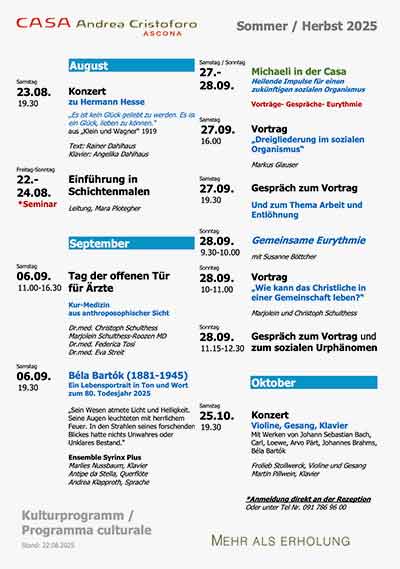 Lungo tutto l’anno, gli ospiti che frequentano la Casa, così come tutte le persone interessate che vivono nella regione, possono assistere ai nostri eventi culturali e alle nostre conferenze. La ricca offerta culturale comprende concerti, recite, euritmia, lettura di racconti, incontri su temi legati all’igiene sociale, alla medicina, alla nutrizione, seminari di pittura e di canto, ricorrenze festive annuali: l’arte come preparazione e accompagnamento alla guarigione.